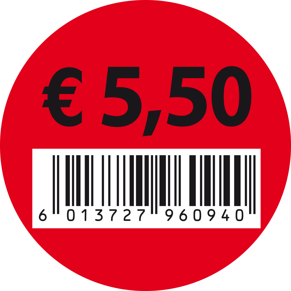 5,50 Euro Sticker Samen Minder Verspillen. Breedte: 37 mm, hoogte: 45 mm. 1260 Stickers per rol. Materiaal is glanzend papier en de hechting is permanent.
